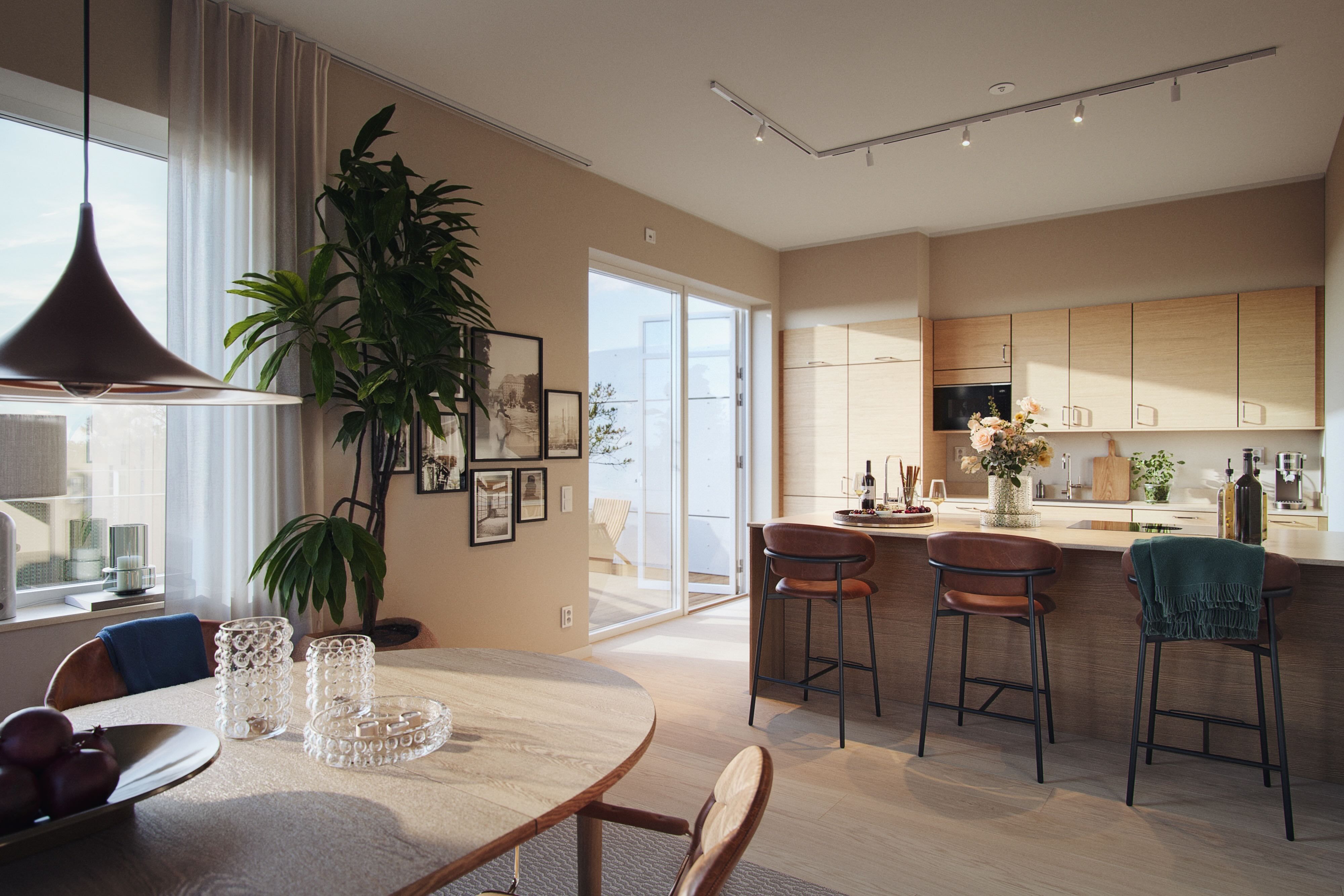 Här bor du i höjd med trädtopparna. Våningen är planerad med en mer privat sovrums- och förvaringsdel och en väl tilltagen sällskapsdel, där kök och vardagsrum bjuder in till allt från större bjudningar till sköna kvällar i soffan. Detta mästerverk är cirka 216 kvadratmeter, vilket ger generösa sällskapsytor och väl tilltagna privata delar av våningen. Terrassen utanför är större än
