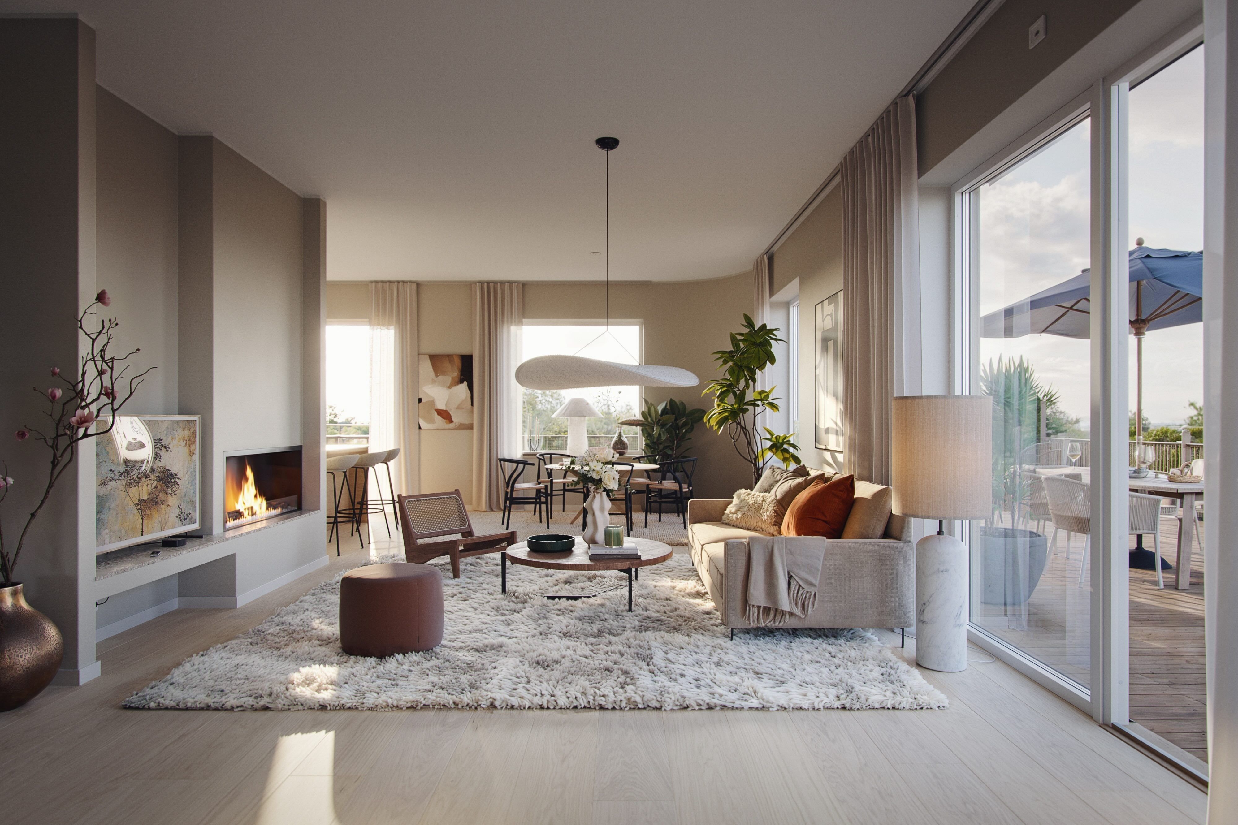 • Terrass runt hela våningen • Inbyggd etanolkamin